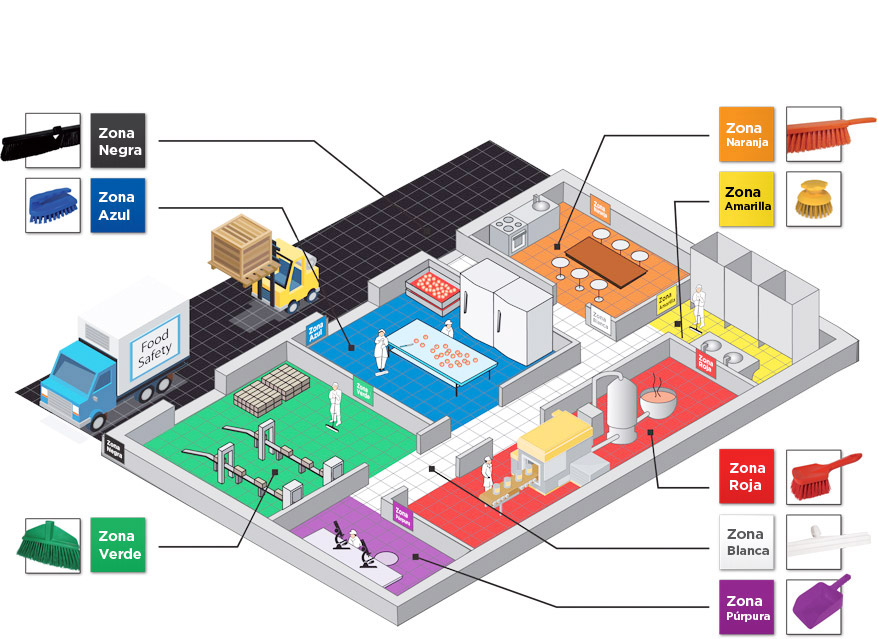 La intención de esta codificación de colores  es evitar la posible contaminación cruzada que a menudo se da por usar las mismas herramientas de limpieza entre  áreas.